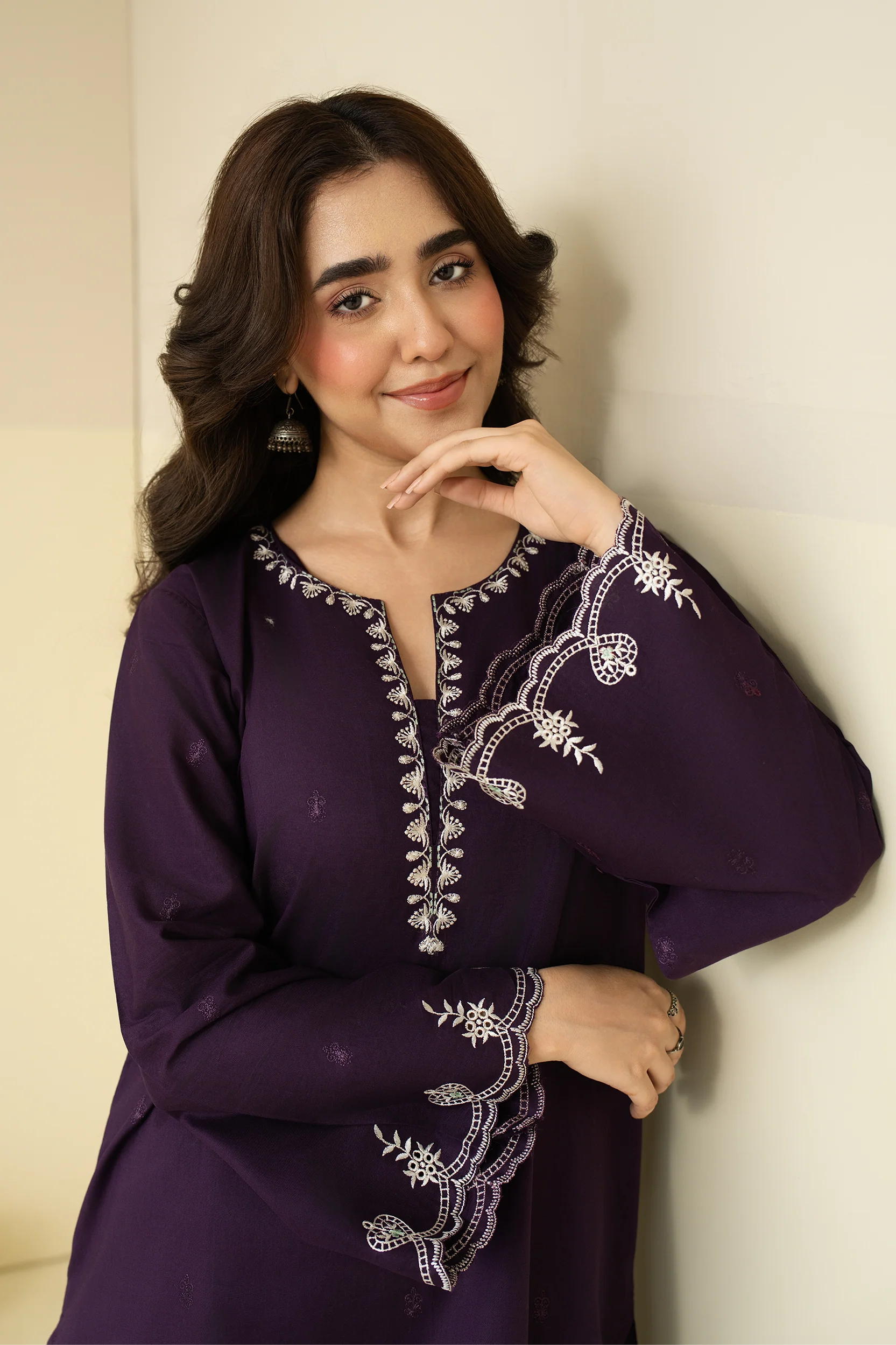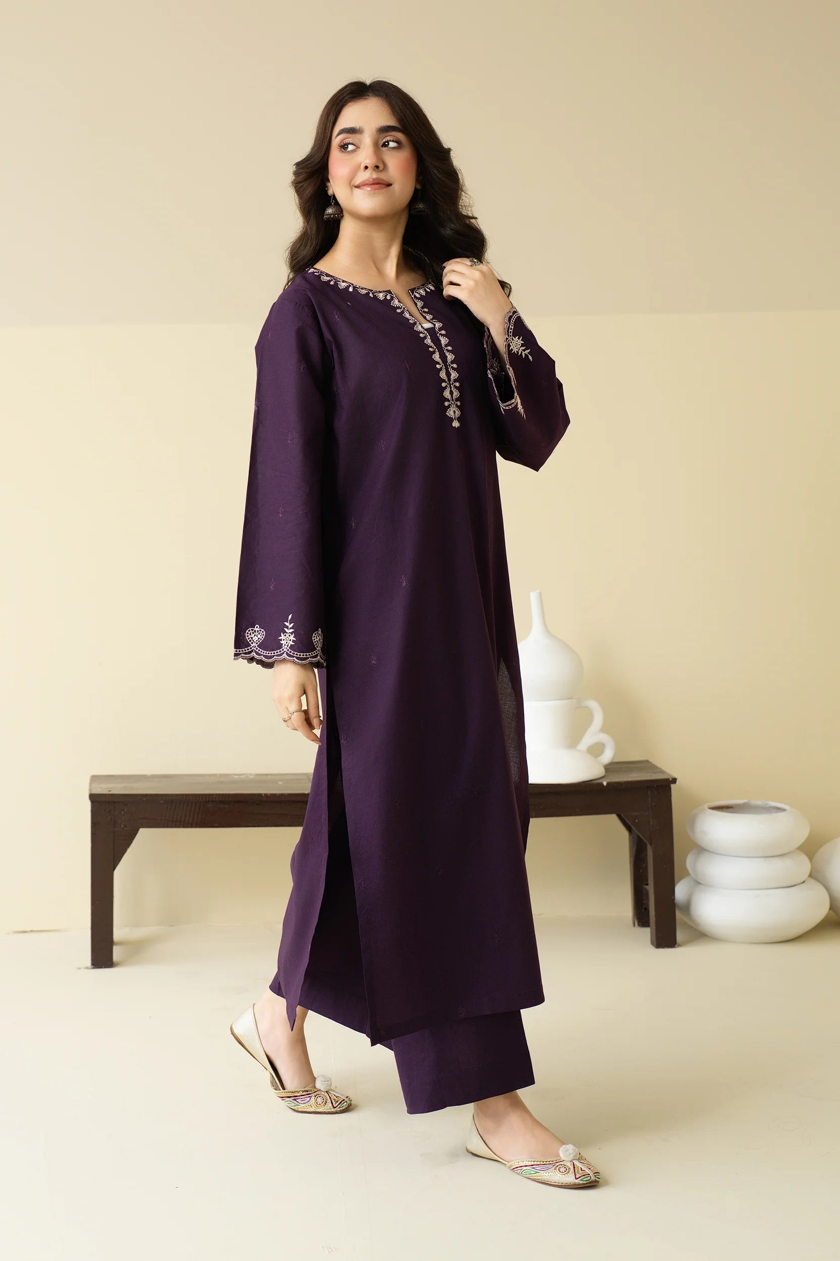 A rich Aimal embroidered kurta paired with straight trousers for an elegant everyday style.