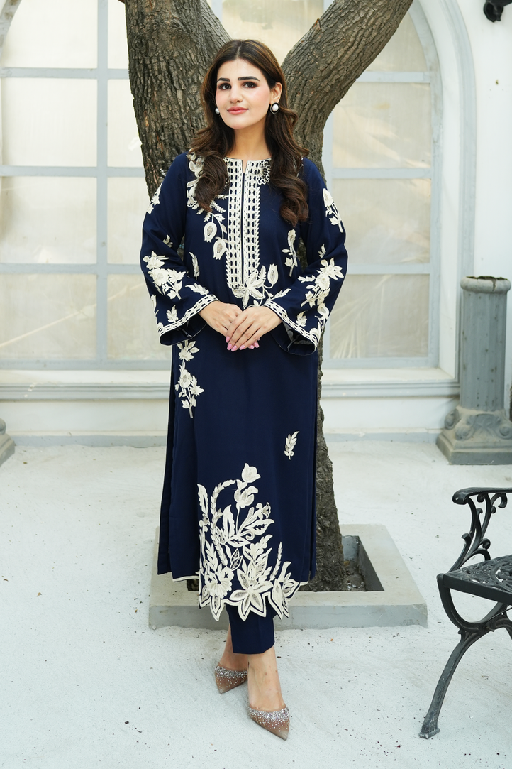 This navy blue two-piece Marina set is enhanced with embroidery and tila work in floral motifs. The shirt features detailed embroidery and tila on the front, sleeves, and cutwork on border, paired with matching trouser and dupatta for a complete look while the Aari embroidery adds texture and depth. A suitable choice for festive occasions, cultural events, and day-to-evening wear.
