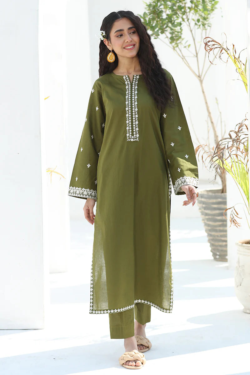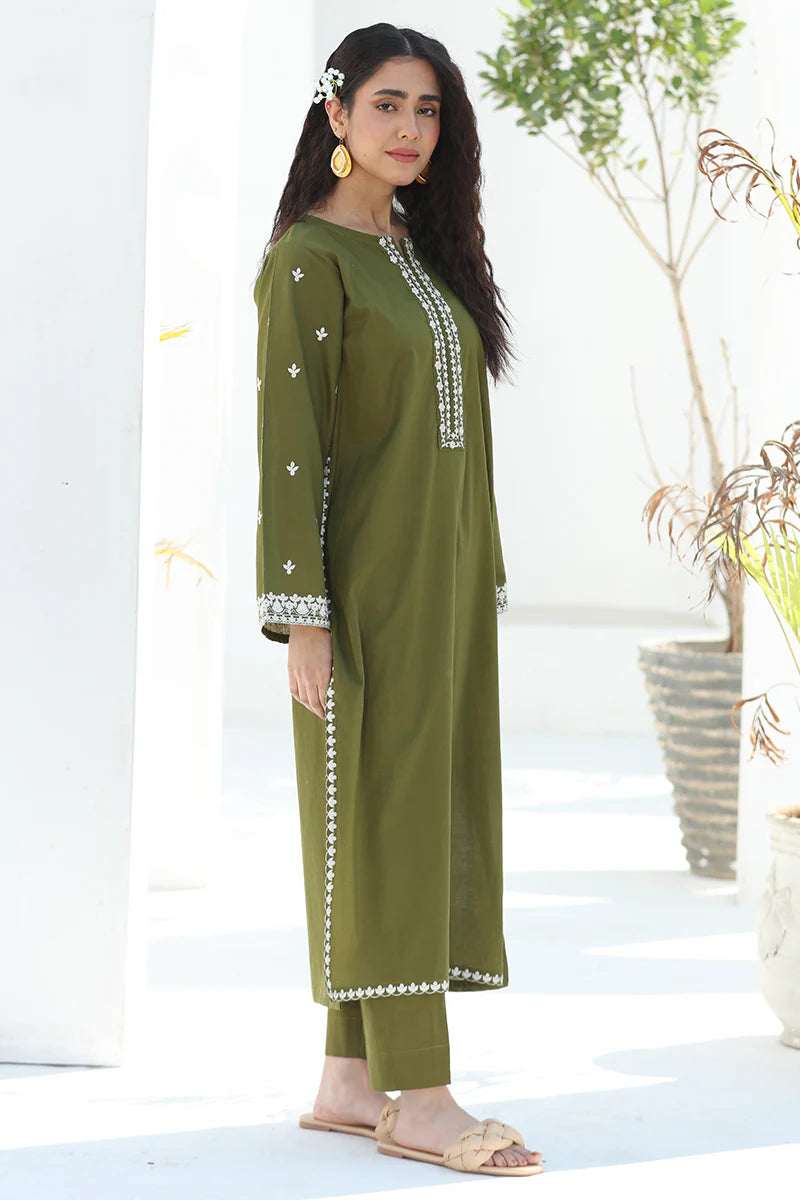 Discover timeless style with our 2-piece embroidered olive green Cotton suit featuring vintage designs with white embroidered flowers on sleeves. Its stitched design allows you to show off your style.