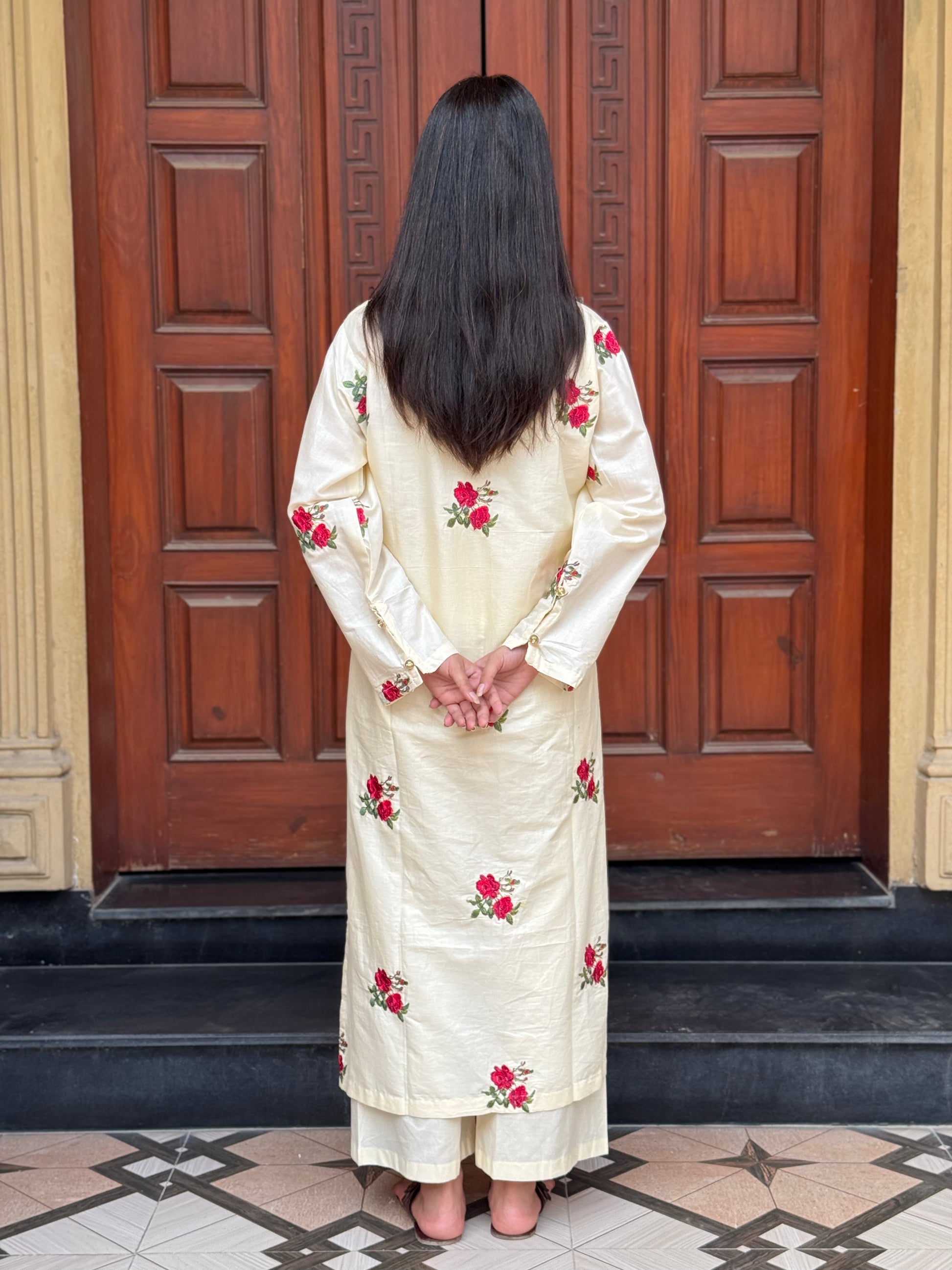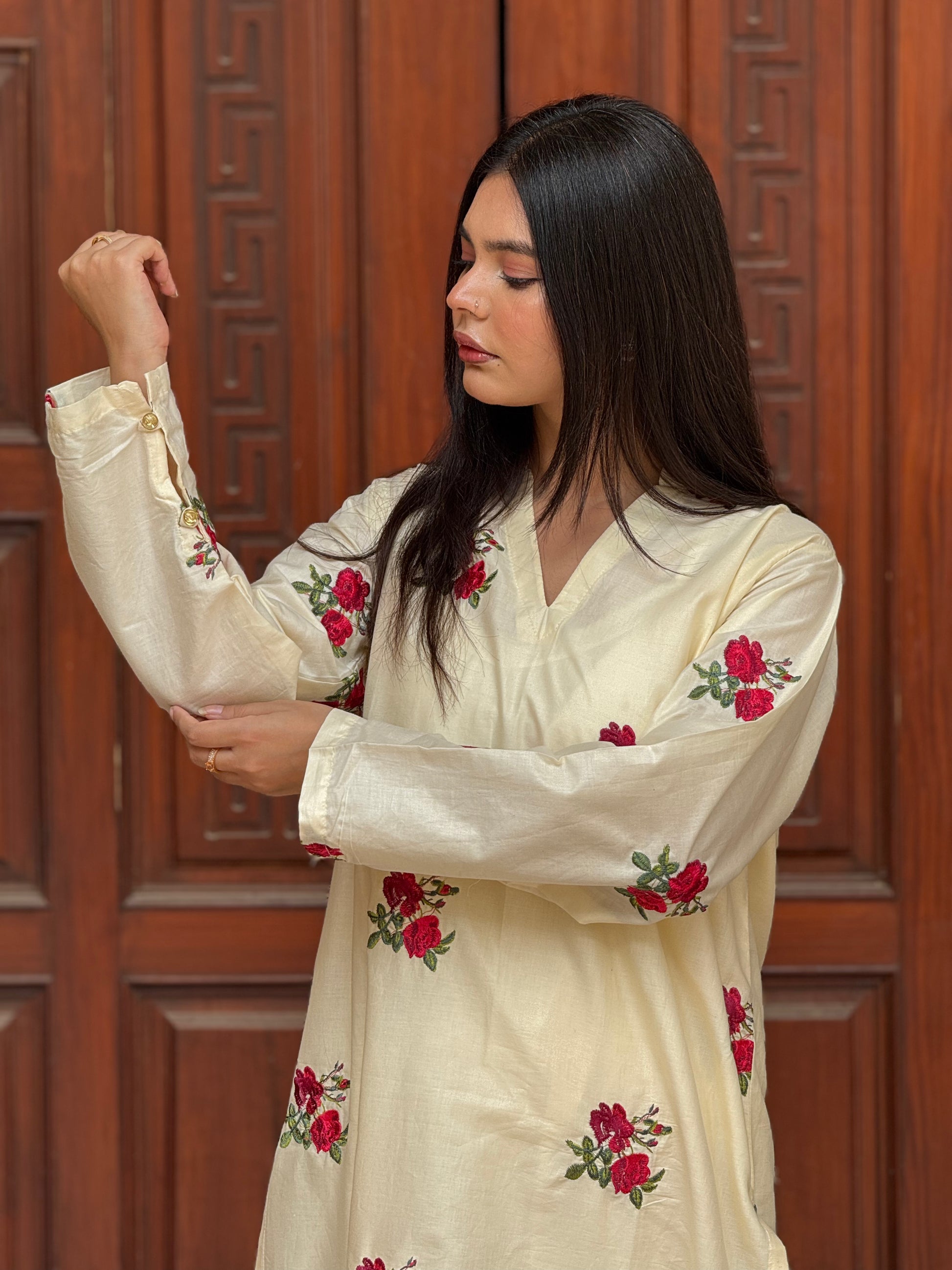 - Embroidery on all over shirt (having pinkish rose embroidery)
