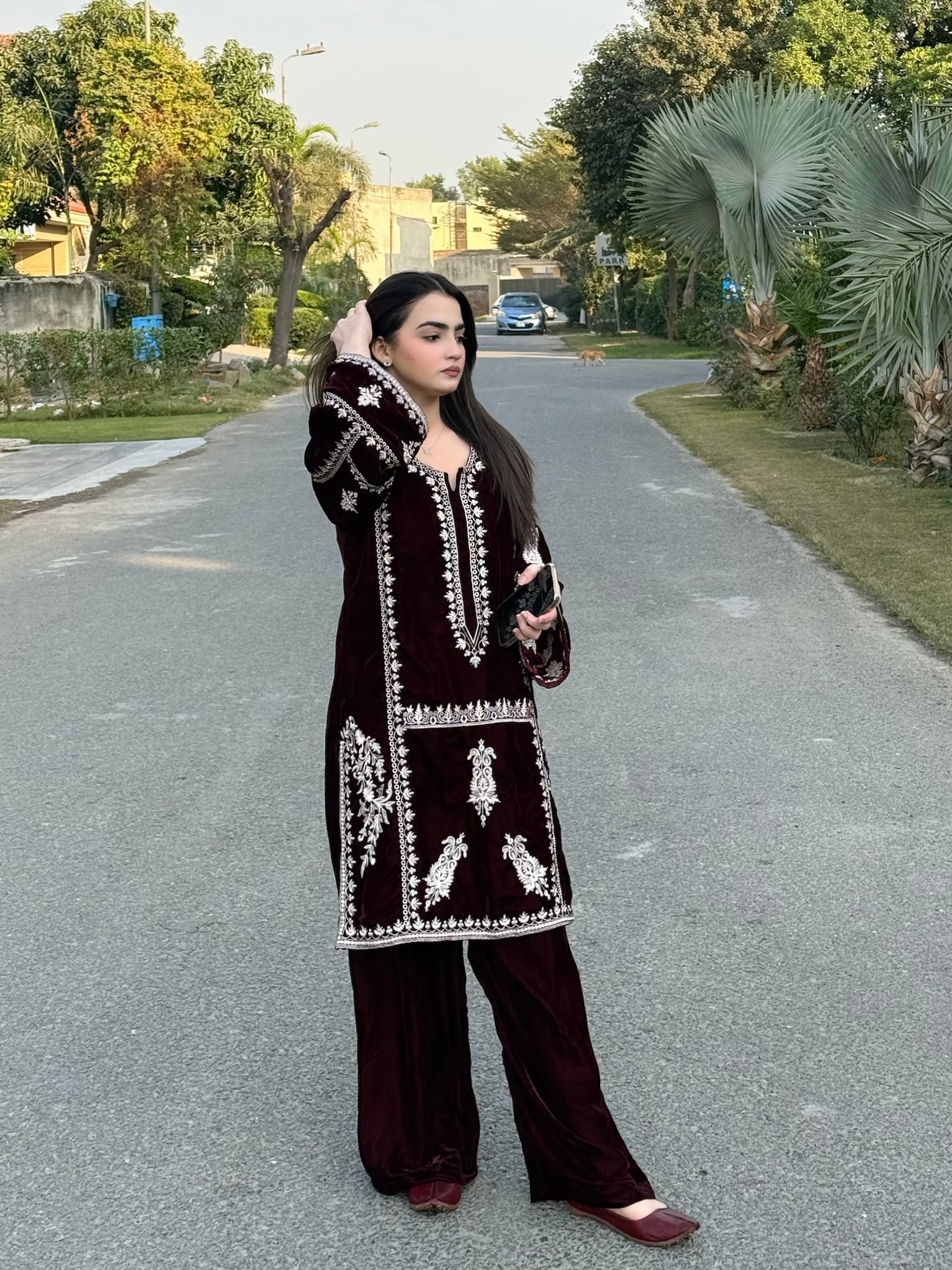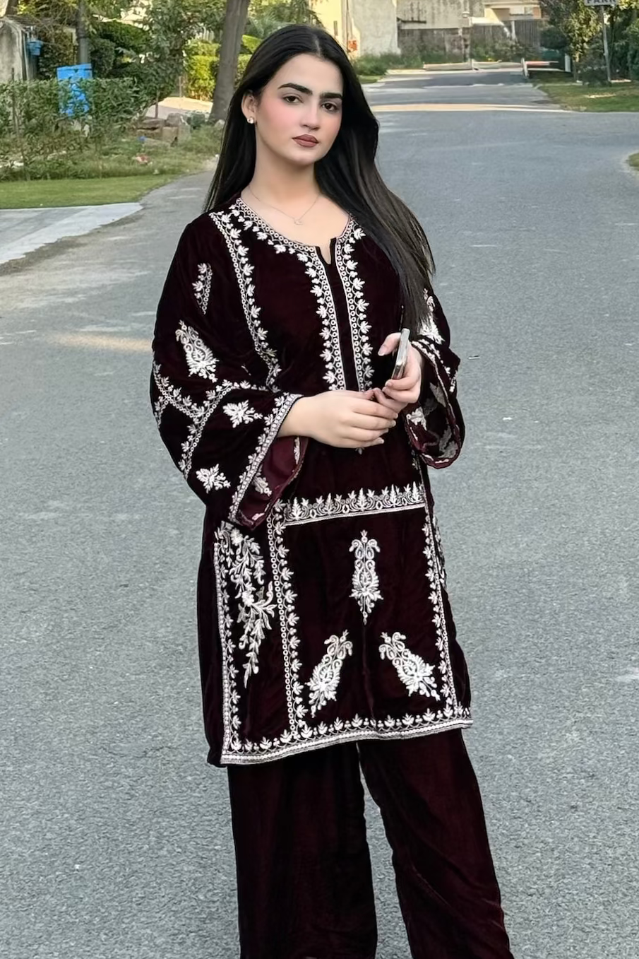 Shirt: Fully machine-embroidered velvet front and sleeves