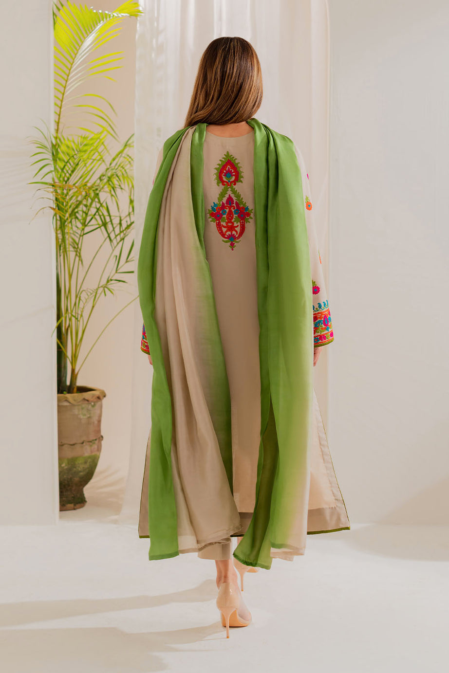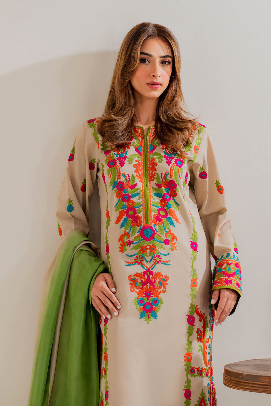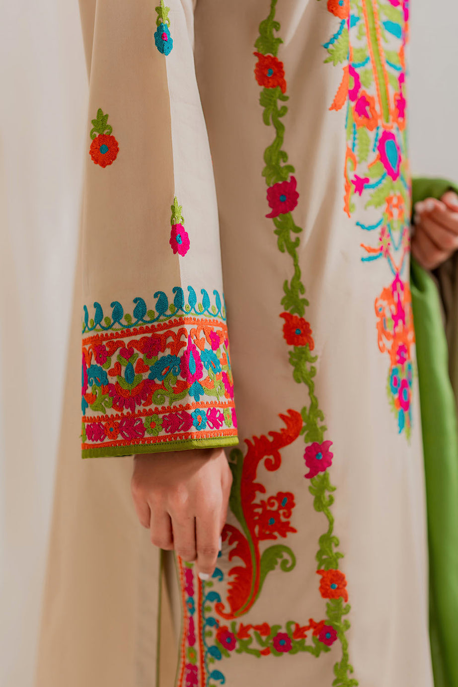 Stay cool and stylish this summer with this elegant beige 2-piece outfit, crafted from breathable Premium Air Cotton. Featuring vibrant multi-colored embroidery on the neckline, sleeves, and hem, it adds a fresh and lively touch to your look. Paired with a matching plain trouser, this lightweight ensemble is perfect for summer days, casual outings, and festive wear.
