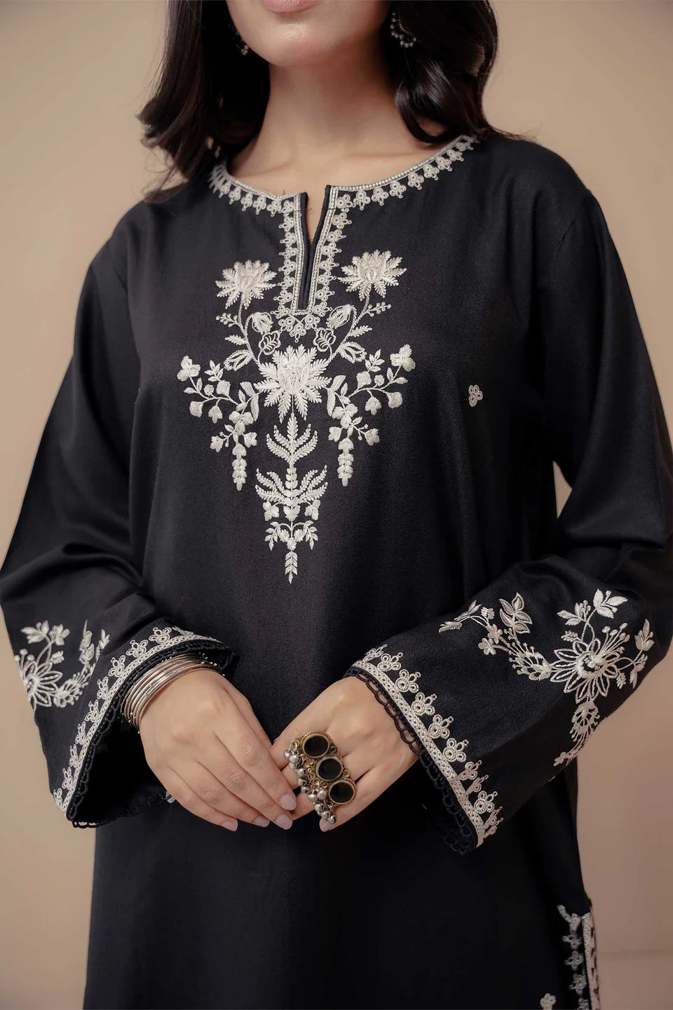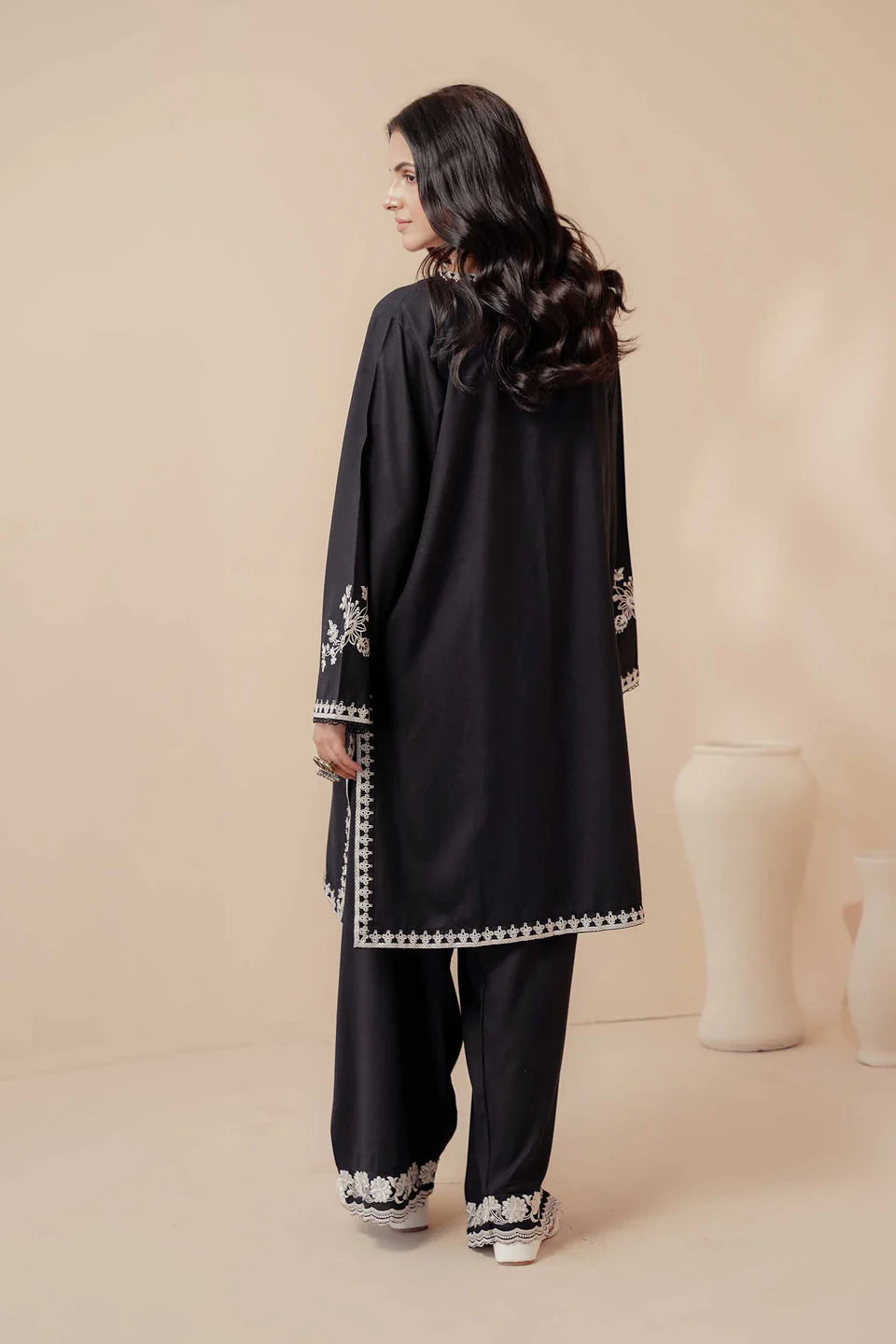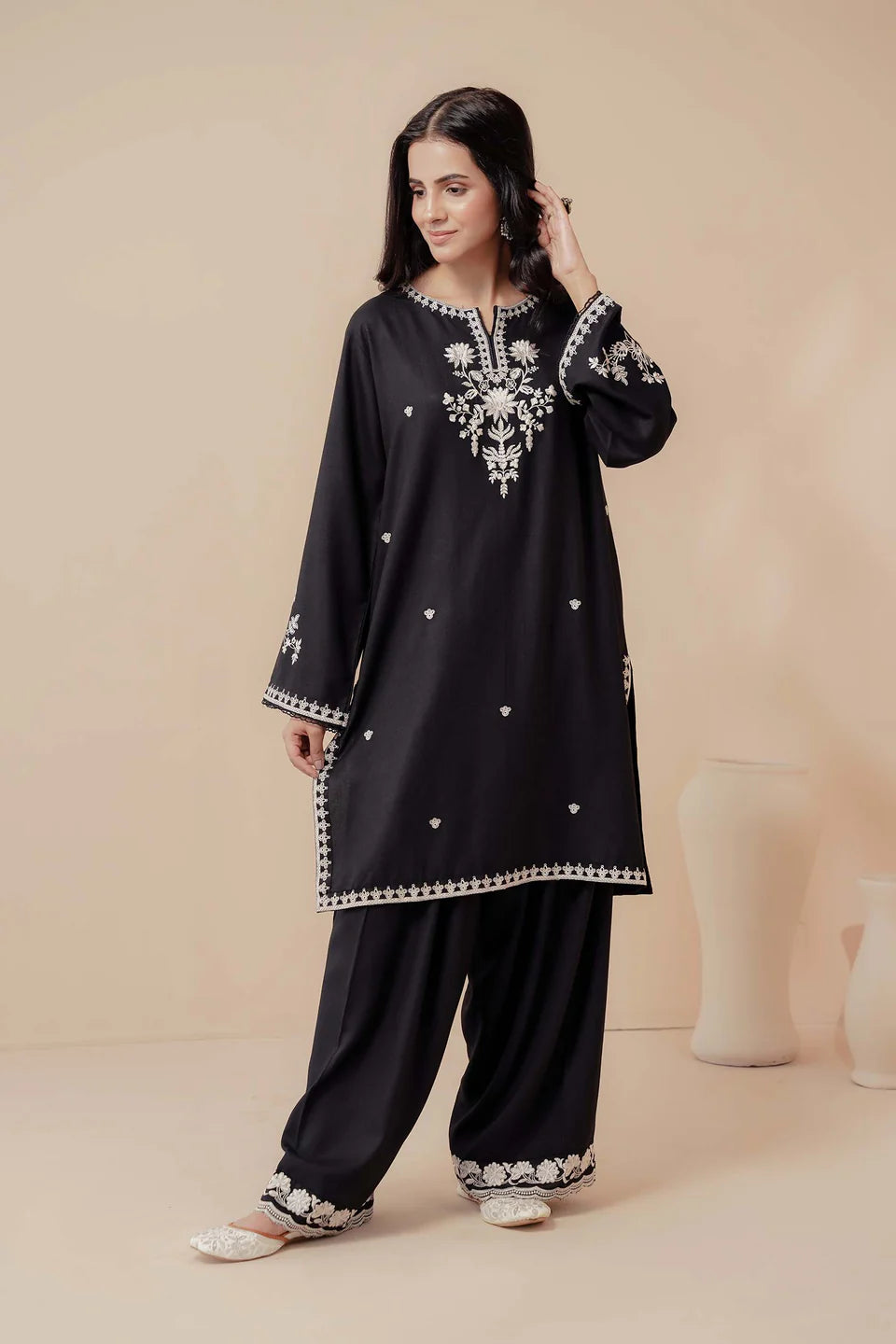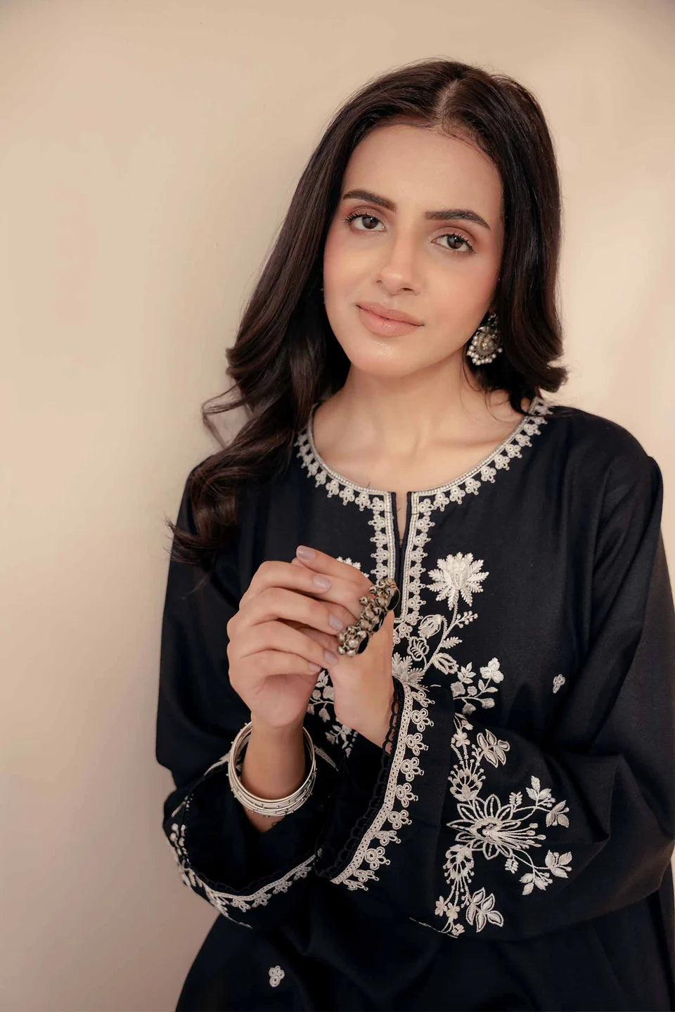 A classic black 2-piece embroidered outfit that embodies elegance and sophistication. Detailed with delicate threadwork on a deep canvas, this timeless piece is perfect for graceful winter occasions.